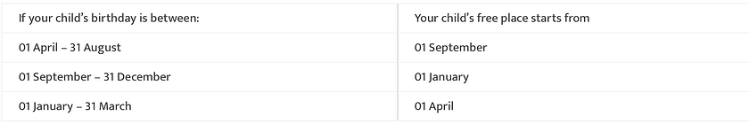 Free Childcare for 2-Year-Olds – Early Years Free Education Entitlement Some two-year-olds are entitled to receive 15 hours free nursery education each week during term time. You can check if you 2-year-old is entitled to the free 15 hours by applying to your local authority. If eligible, you can claim your child’s free nursery place at KIM Nursery from the term after his/ her second birthday as shown in Table 1 below: